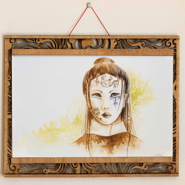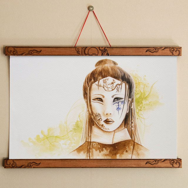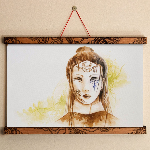 Vous pouvez également choisir l'illustration avec son cadre en bois gravé et aimanté, soit sous forme de kakémono soit sous forme de cadre complet. Pour les kakémonos : deux motifs différents (nuage ou grue) sont disponibles. Un cadre correspond à deux baguettes et leurs fonds aimantés, à placer en haut et en bas de l'illustration. Il suffit simplement de placer l'illustration entre les aimants de chaque baguette.