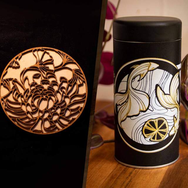 Boite à thé en métal habillé de papier réalisé à partir d'une aquarelle ("poisson japonais") ou sérigraphié à la main (toutes les autres boîtes).