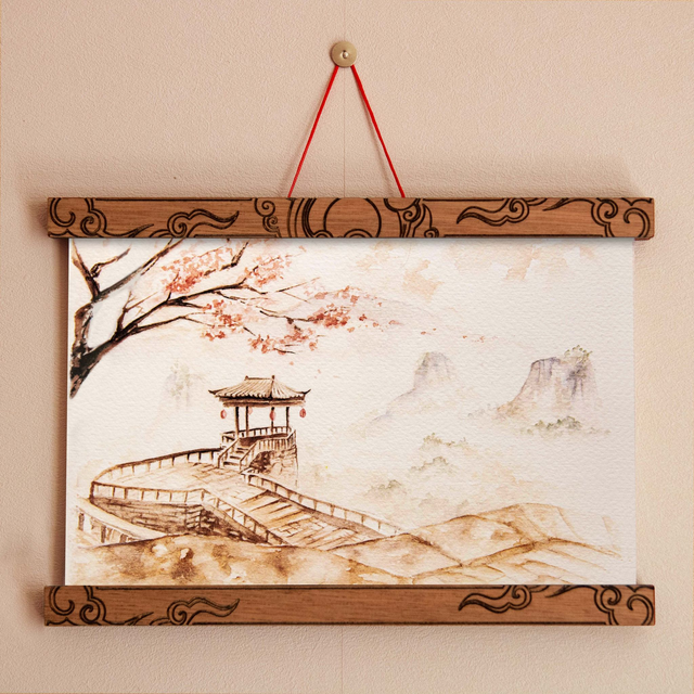 Vous pouvez également choisir l'illustration avec son cadre en bois gravé et aimanté, soit sous forme de kakémono soit sous forme de cadre complet. Pour les kakémonos : deux motifs différents (nuage ou grue) sont disponibles. Un cadre correspond à deux baguettes et leurs fonds aimantés, à placer en haut et en bas de l'illustration. Il suffit simplement de placer l'illustration entre les aimants de chaque baguette.