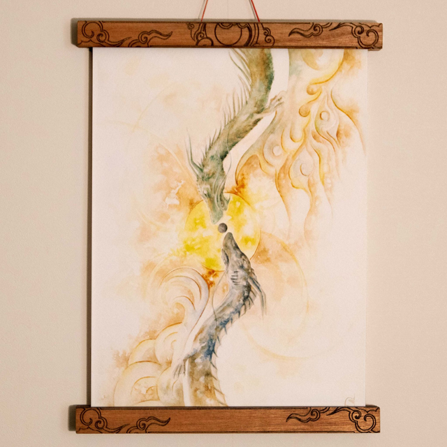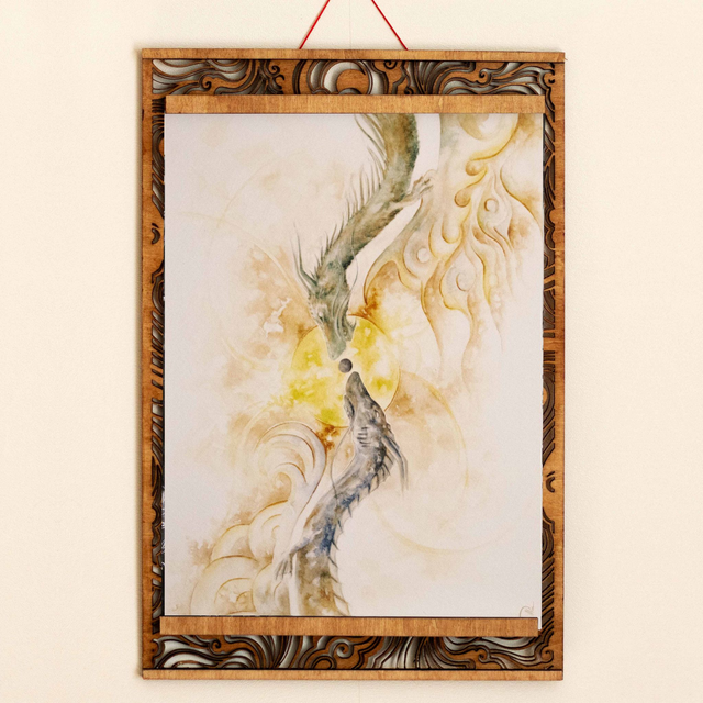 Vous pouvez également choisir l'illustration avec son cadre en bois gravé et aimanté, soit sous forme de kakémono soit sous forme de cadre complet. Pour les kakémonos : deux motifs différents (nuage ou grue) sont disponibles. Un cadre correspond à deux baguettes et leurs fonds aimantés, à placer en haut et en bas de l'illustration. Il suffit simplement de placer l'illustration entre les aimants de chaque baguette.